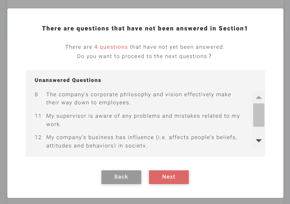 If there are unanswered questions for each question, the following confirmation screen will appear before moving on to the next screen.