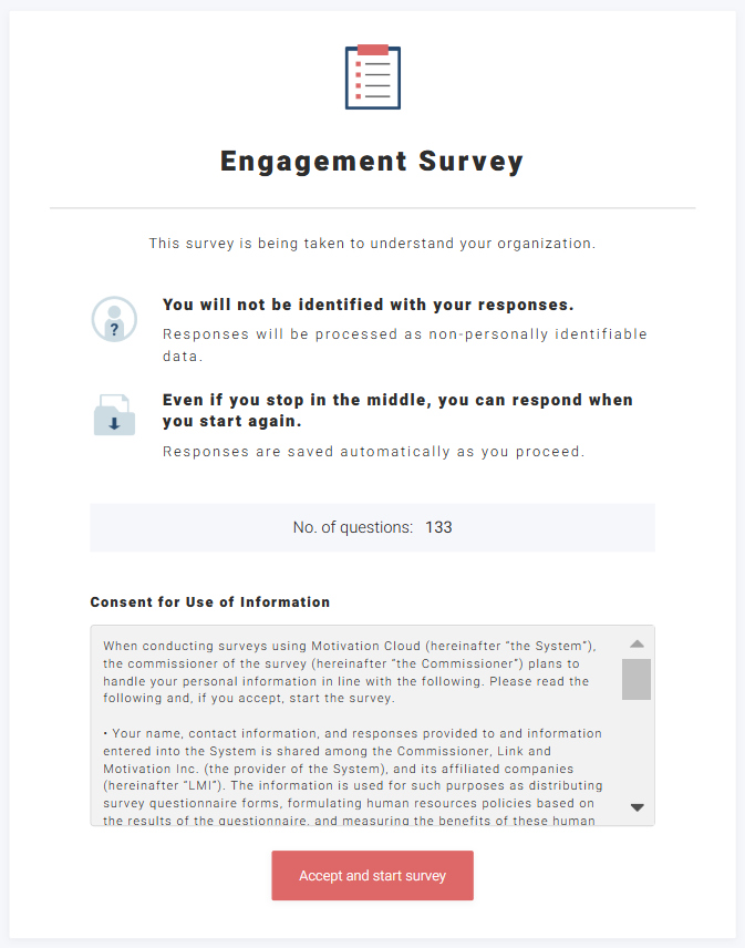 When respondents answer the Engagement Survey or Focus Survey, they may be required to consent to the collection of personal information on the answer screen.