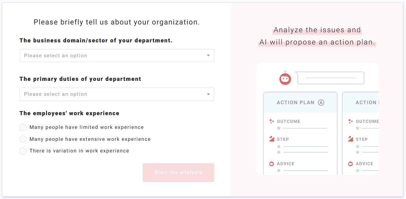 This feature allows Action Plan Managers to receive AI-generated improvement suggestions tailored to their department’s situation simply by answering a few questions. This enables the smooth and effective creation of action plans. This feature is available only for departments registered in the Organization Settings.