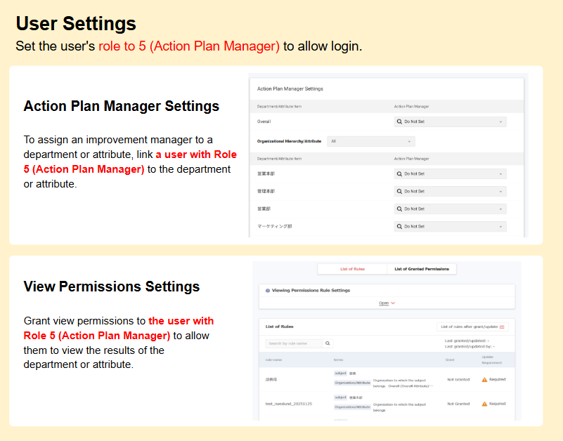 ※2: To allow an Action Plan Manager (Role 5) with view permissions to register improvement items and action plans, you must assign them as an Action Plan Manager in "Action Plan Manager Settings".