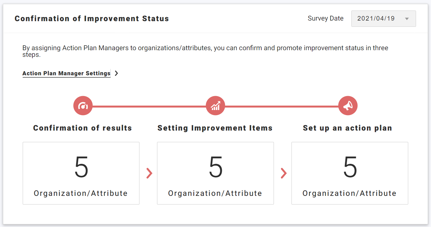 In "Confirmation and Promotion of Improvement Status," you can track the progress of improvement activities by the Action Plan Manager. Please utilize this feature to promote your improvement activities.