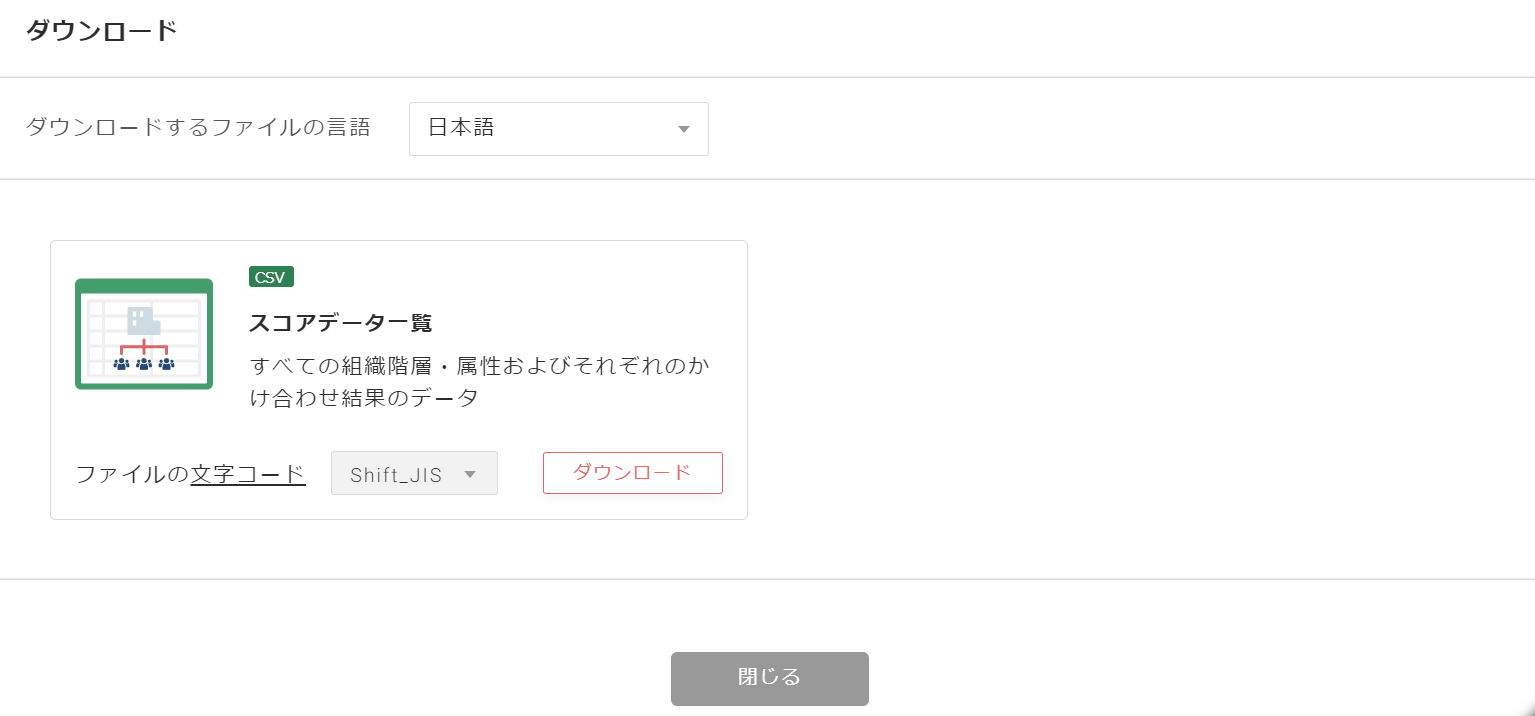アクションプラン担当者は、「アクションプラン担当者設定」または「閲覧権限設定」で設定されている属性のスコアデータ一覧をダウンロードできます。