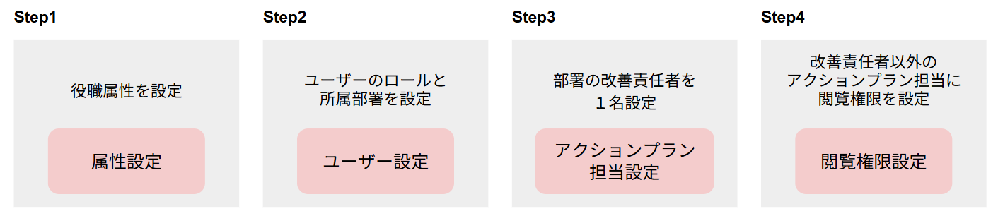 ユーザーがサーベイ結果を閲覧するためには、さらに閲覧対象の部署を指定する必要があります。 「アクションプラン担当者設定」(Step3)または「閲覧権限設定」(Step4)で、必要な設定を行ってください。 参考:アクションプラン担当者(ロール5)とアクションプラン担当者設定の違いがわからない |