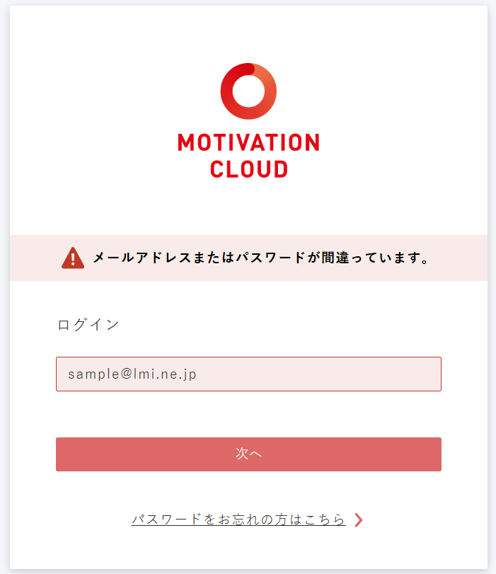 「メールアドレスまたはパスワードが間違っています。」というメッセージが表示される場合は