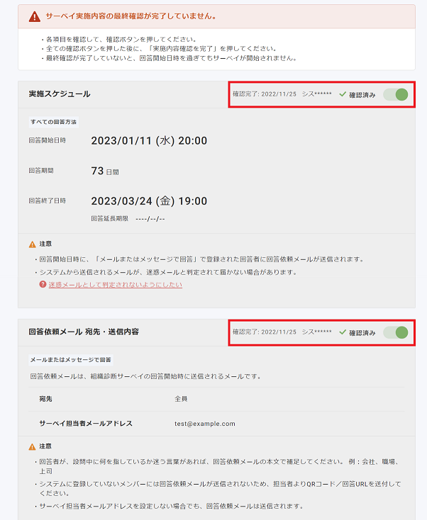 一度実施内容確認を完了すると、その後サーベイの設定を変更したとしても、再度実施内容を確認する必要はありません。