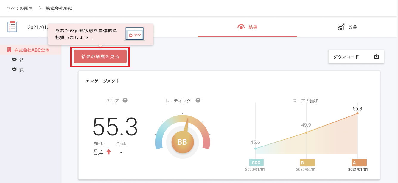 - 担当部署の結果画面にある「結果の解説を見る」をクリック