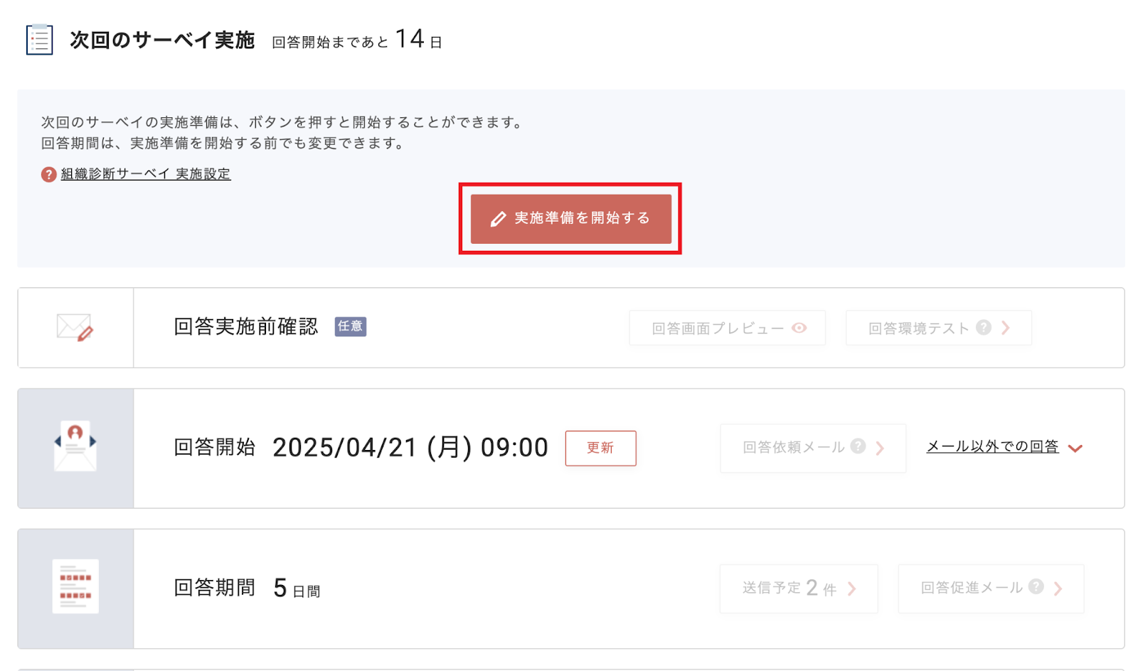 組織診断サーベイの実施設定画面に、『実施準備を開始する』ボタンを新たに追加します。